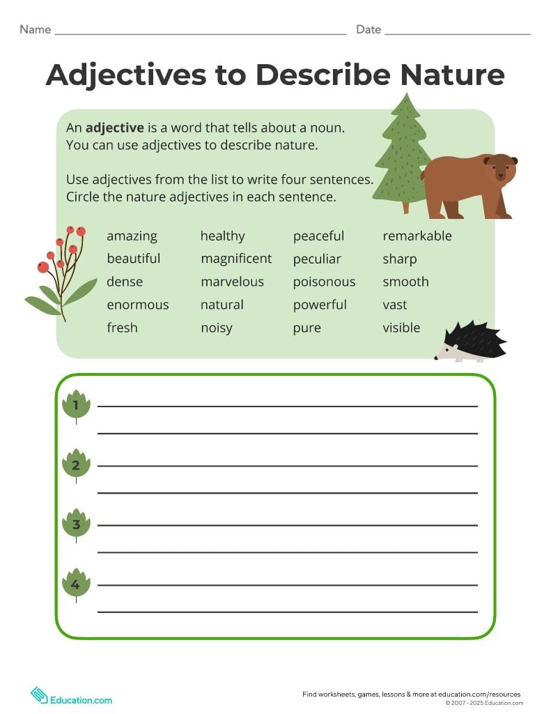 Students use a word bank of nature-related adjectives to write descriptive sentences about the natural world. As they craft their sentences, learners broaden their vocabulary and improve their written and verbal communication skills.