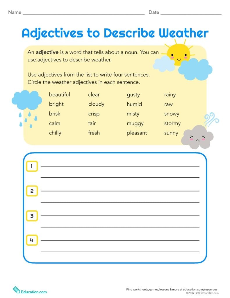 Learners use weather-related adjectives to write sentences about the weather, circling the adjectives they include. Designed for grades 2–4, this activity helps learners apply grammar skills in context and make their writing clearer and engaging.