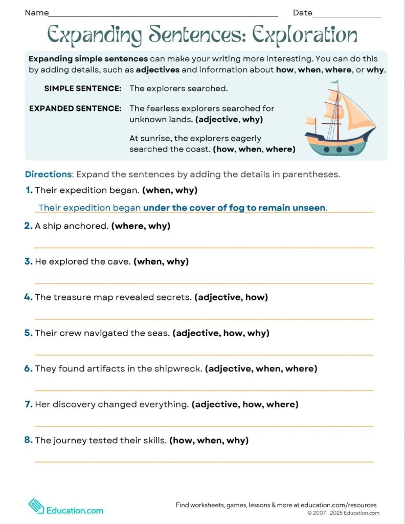 Encourage fifth through eighth graders to turn simple sentences into detailed descriptions. As students add details about where, when, why, and how, they’ll practice using adjectives and noun phrases while writing about exciting topics like treasures and shipwrecks.